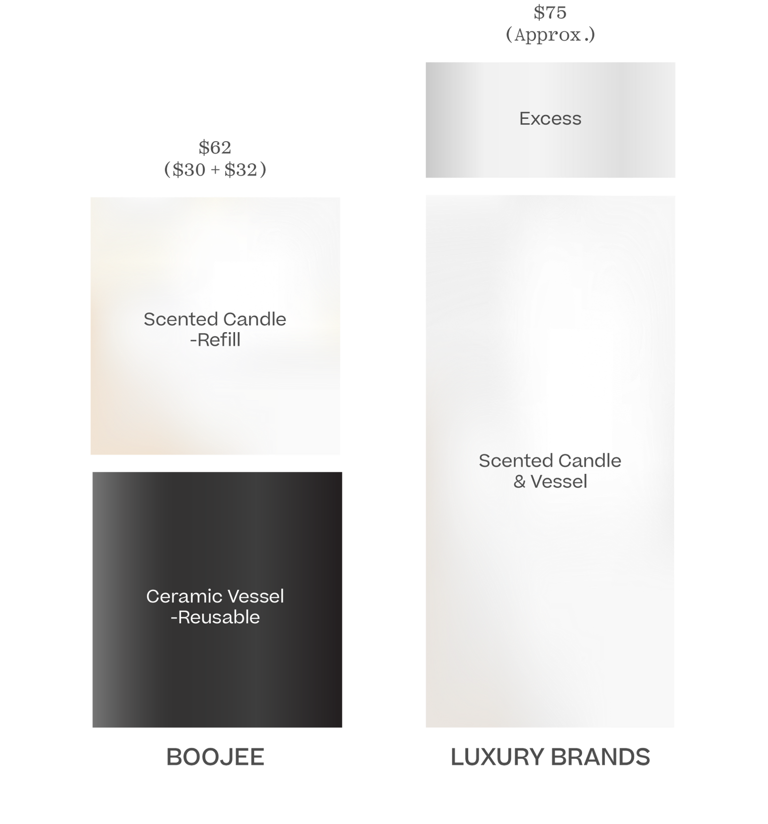 Simply buy what you need—be it a scented candle refill or a reusable vessel— always with minimal packaging. Our approach not only strips away hidden costs and unnecessary extras, but also serves our commitment to sustainability.