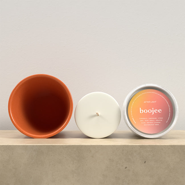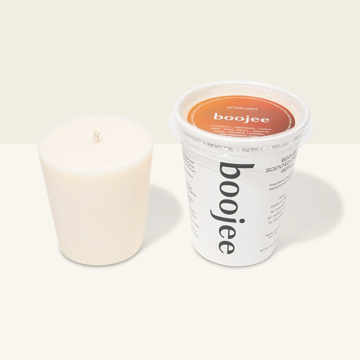 Remove the candle refill from the cup container and place into a Boojee vessel before burning.